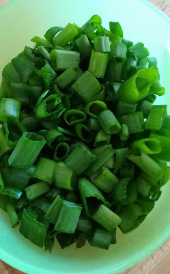Après avoir manger les oignons nouveaux, reste les fanes vertes, que je découpe en rondelles pour agrémenter vinaigrettes, salades et entrées.