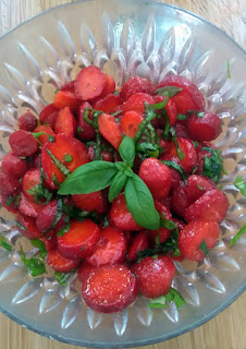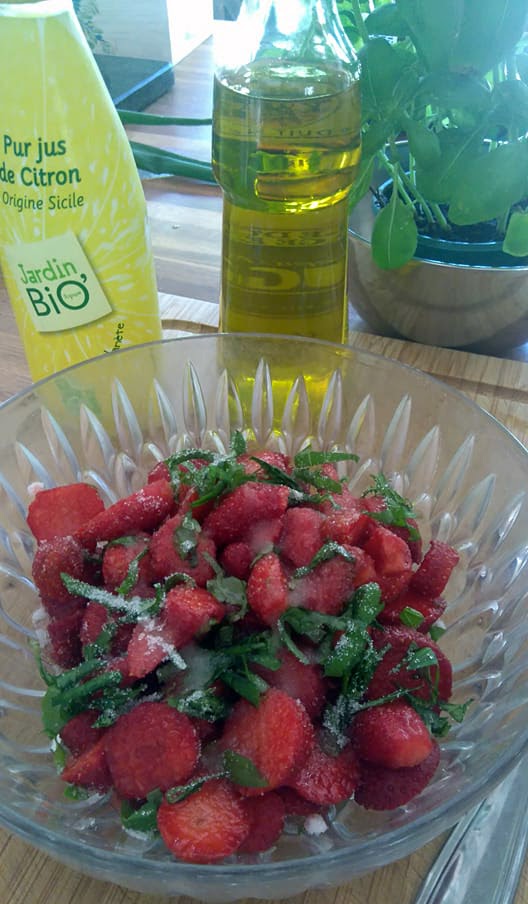 Tailler les feuilles de 3 branches de basilic les ajouter aux fraises, ajouter une cuillère d’huile d’olive de qualité.