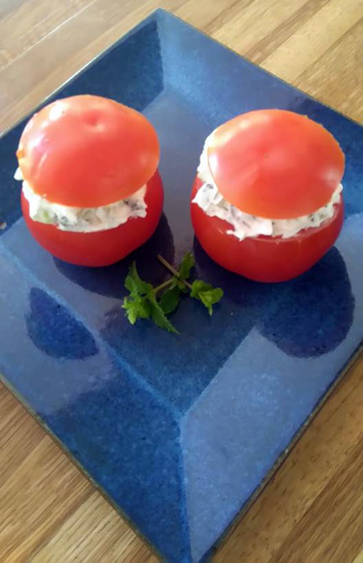 Mélanger fromage blanc, menthe, concombre, une cuillère à soupe d’huile d’olive, saler, poivrer et farcir les tomates.
