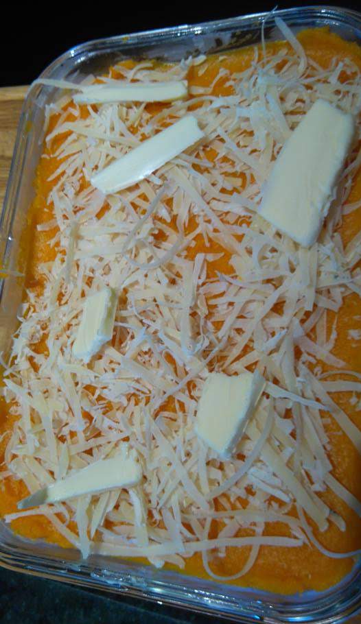 Ajouter quelques noisettes de beurre et du parmesan râpé. Enfourner à 200 durant 20 min.