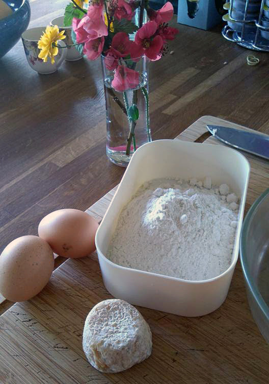 Préparer 2 œufs, 100 g de farine et un chèvre.
