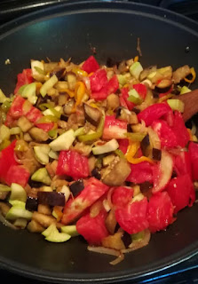 Pendant que ça rissole doucement, tailler les tomates, les ajouter, puis ajouter l’ail, les herbes, sel poivre laisser mijoter 10 min.