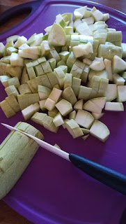 Pendant que ça rissole doucement, Tailler les aubergines en cubes, les ajouter.