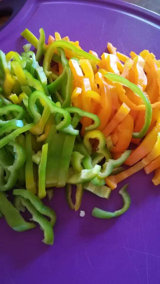 Tailler les poivrons en lanières, faire revenir l’oignon dans l’huile d’olive, puis les poivrons.