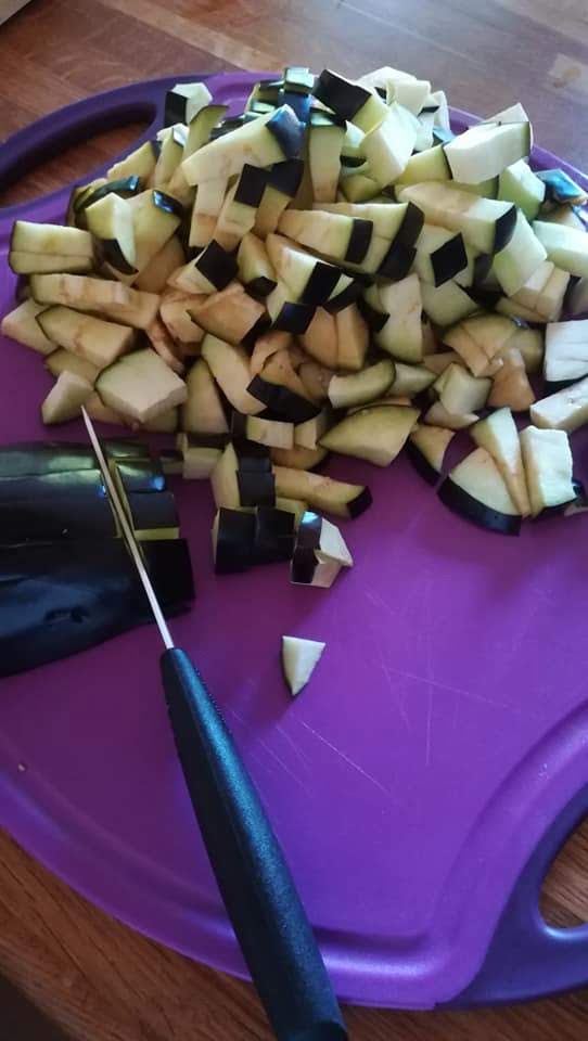 Pendant que ça rissole doucement, Tailler les aubergines en cubes, les ajouter.
