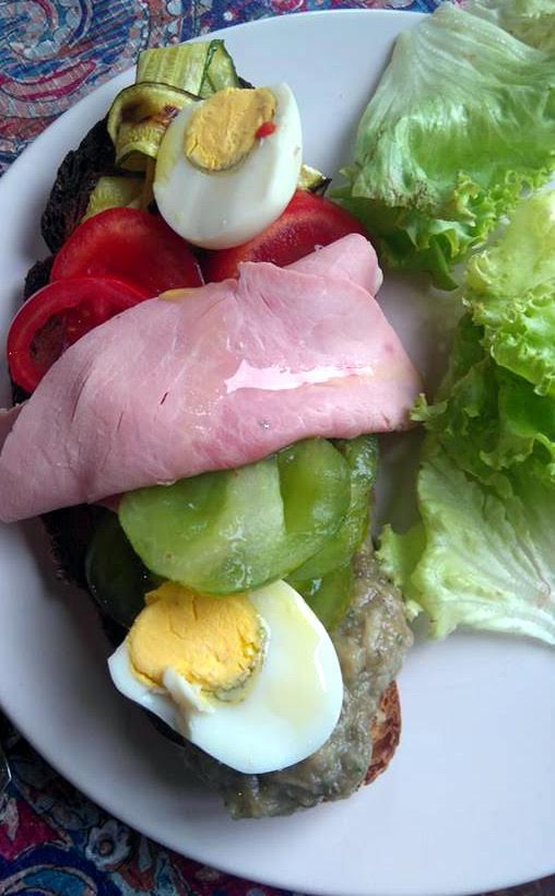 Ajouter selon votre goût du caviar d’aubergines, des lanières grillées de courgettes, des tomates tranchées, un œuf dur, du jambon ou du thon, sel poivre et un filet d’huile d’olive.